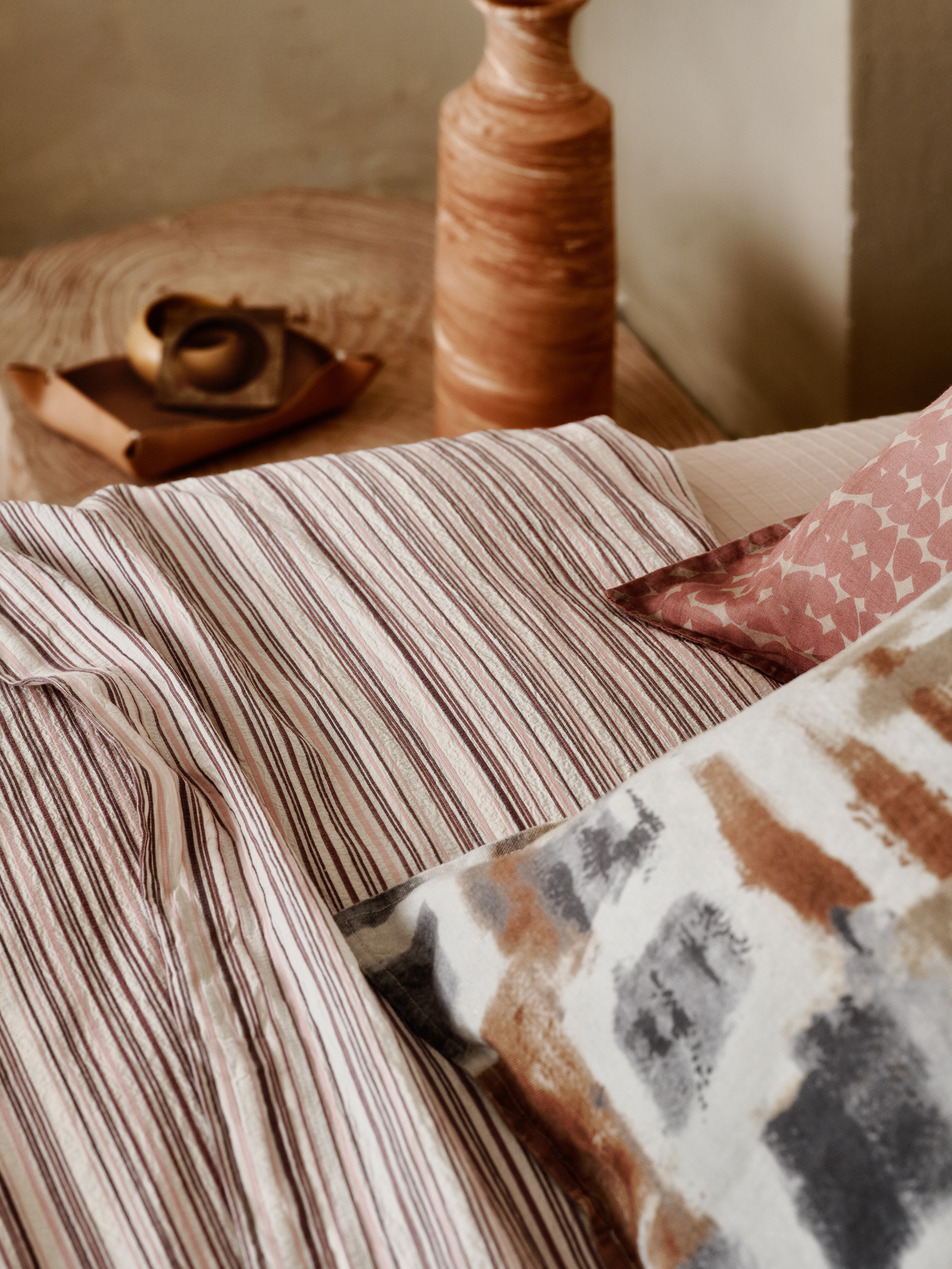 Sul letto, Society Limonta propone tessuti ricchi di dettagli, come ROWS, uno jacquard a righe multicolore e FIELD, lenzuolo in voile di cotone stampato, il cui motivo ricorda uno spontaneo e pittorico campo fiorito.